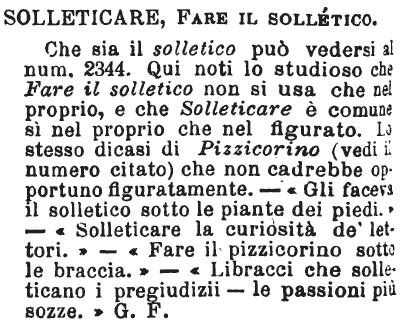 | Solleticare, Fare il solletico - Che sia il solletico può vedersi al num. 2344. Qui noti lo studioso che Fare il solletico non si usa che nel proprio, e che Solleticare è comune sì nel proprio che nel figurato. Lo stesso dicasi di Pizzicorino (vedi il numero citato) che non cadrebbe opportuno figuratamente. - « Gli faceva il solletico sotto le piante dei piedi. » - « Solleticare la curiosità de' lettori. » - « Fare il pizzicorino sotto le braccia. » - « Libracci che solleticano i pregiudizii - le passioni più sozze. » G. F. [immagine] |