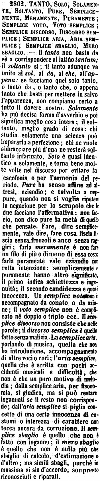 | Tanto, Solo, Solamente, Soltanto, Pure, Semplicemente, Meramente, Puramente; Semplice voto, Voto semplice; Semplice discorso, Discorso semplice; Semplice aria, Aria semplice; Semplice sbaglio, Mero sbaglio - Il tanto non basta da sè a corrispondere al latino tantum; il soltanto sì; il tanto adunque va unito al sol, al da, al che, all'appena: se facciamo quel solo tanto, o tanto da, o tanto che, o appena tanto che basti per mettere in salvo l'apparenza, non compiamo certo a tutto il dovere nostro. Solamente ha più decisa forma d'avverbio e poi significa meglio cosa intera; il soltanto, meglio grado di cosa: chi studia solamente una scienza può impararla a perfezione; chi ne vuole abbracciare più d'una ne resterà soltanto infarinato. Solo è quasi identico a solamente, e torna bene molte volte nel discorso per evitare la cacofonia o per l'armonia del periodo. Pure ha senso affine ad altresì, eziandio; e talvolta a neppure, quando non si voglia ripetere la negazione per lo scrupolo che le due facciano l'affermativa: non faccio, non dico pure la metà di quello che pensate. Fare, dire semplicemente, vale dire, fare cosa liscia liscia senza fronzoli e anco senza raggiri; farla meramente è non fare un filo di più o di meno di essa cosa; farla puramente vale eziandio con retta intenzione: semplicemente e puramente hanno altro significato, il primo indica schiettezza e ingenuità; il secondo candidezza e quasi innocenza. Un semplice voto non è accompagnato da conato o da azione; il voto semplice non è complicato nè doppio o triplo ecc. Il semplice discorso non consiste che nelle parole; il discorso semplice è quello fatto senza malizia. La semplice aria, parlando di musica, quella che non ha introduzione, accompagnamento di altre voci o cori; l'aria semplice, quella che è scritta con pochi accidenti musicali e difficoltà, che non è che un puro motivo di melodia; dalla semplice aria, per fisonomia, si giudica, ma si può restare ingannati se il resto non corrisponde; dall'aria semplice si piglia concetto di una certa innocenza di costumi o interezza di carattere non tocca ancora da corruzione. Il semplice sbaglio è quello che non è fatto con inganno; il mero sbaglio è quello che non è nulla più che sbaglio di calcolo, d'estimazione o d'altro; ma simili sbagli, purchè in massima si sia d'accordo, son presto riconosciuti e riparati. [immagine] |
