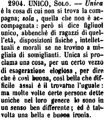 | Unico, Solo - Unica è la cosa di cui non si trova la compagna; sola, quella che non è accompagnata: però si dice figliuol unico, abbenchè di ragazzi di quell'età, disposizioni fisiche, intellettuali e morali se ne trovino a migliaia di somiglianti. Unica si proclama una cosa, per un certo vezzo di esagerazione elogiosa, per dire che è così buona, così bella che difficile assai è il trovarne l'uguale: ma molte volte certe persone dette uniche nel loro genere lo sono in un senso ben differente; ed è talvolta una bella e buona ironia. [immagine] |