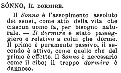 Sonno, Il dormire - Il Sonno è l'assopimento assoluto dei sensi, come atto della vita che ciascun uomo fa, per bisogno naturale. - Il dormire è stato passeggiero e relativo a colui che dorme. Il primo è puramente passivo, il secondo è attivo, come quello che del primo è effetto. Il Sonno è necessario come il cibo; il troppo dormire è dannoso. [immagine]