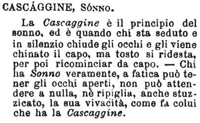 Cascaggine, Sonno - La Cascaggine è il principio del sonno, ed è quando chi sta seduto e in silenzio chiude gli occhi e gli viene chinato il capo, ma tosto si ridesta, per poi ricominciar da capo. - Chi ha Sonno veramente, a fatica può tener gli occhi aperti, non può attendere a nulla, nè ripiglia, anche stuzzicato, la sua vivacità, come fa colui che ha la Cascaggine. [immagine]