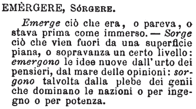| Emergere, Sorgere - Emerge ciò che era, o pareva, o stava prima come immerso; sorge ciò che vien fuori da una superficie piana o sopravanza un certo livello: emergono le idee nuove dall'urto de' pensieri, dal mare delle opinioni: sorgono talvolta dalla plebe, dei genii che dominano le nazioni o per ingegno o per potenza. [immagine] |