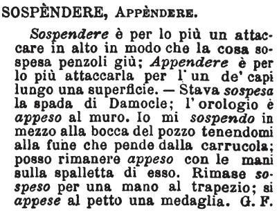 | Sospendere, Appendere - Sospendere è per lo più un attaccare in alto in modo che la cosa sospesa penzoli giù; Appendere è per lo più attaccarla per l'un de' capi lungo una superficie. - Stava sospesa la spada di Damocle; l'orologio è appeso al muro. Io mi sospendo in mezzo alla bocca del pozzo tenendomi alla fune che pende dalla carrucola; posso rimanere appeso con le mani sulla spalletta di esso. Rimase sospeso per una mano al trapezio; si appese al petto una medaglia. G. F. [immagine] |