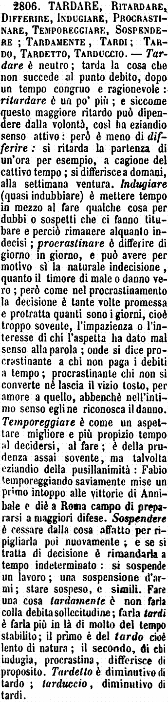 | Tardare, Ritardare, Differire, Indugiare, Procrastinare, Temporeggiare, Sospendere; Tardamente, Tardi; Tardo, Tardetto, Tarduccio - Tardare è neutro; tarda la cosa che non succede al punto debito, dopo un tempo congruo e ragionevole: ritardare è un po' più; e siccome questo maggiore ritardo può dipendere dalla volontà, così ha eziandio senso attivo: però è meno di differire: si ritarda la partenza di un'ora per esempio, a cagione del cattivo tempo; si differisce a domani, alla settimana ventura. Indugiare (quasi indubbiare) è mettere tempo in mezzo al fare qualche cosa per dubbi o sospetti che ci fanno titubare e perciò rimanere alquanto indecisi; procrastinare è differire di giorno in giorno, e può avere per motivo sì la naturale indecisione, quanto il timore di male o danno vero; però come nel procrastinamento la decisione è tante volte promessa e protratta quanti sono i giorni, cioè troppo sovente, l'impazienza o l'interesse di chi l'aspetta ha dato mal senso alla parola; onde si dice procrastinante a chi non paga i debiti a tempo; procrastinante chi non si converte nè lascia il vizio tosto, per amore a quello, abbenchè nell'intimo senso egli ne riconosca il danno. Temporeggiare è come un aspettare migliore e più propizio tempo al decidersi, al fare; è della prudenza assai sovente, ma talvolta eziandio della pusillanimità: Fabio temporeggiando saviamente mise un primo intoppo alle vittorie di Annibale e diè a Roma campo di prepararsi a maggiori difese. Sospendere è cessare dalla cosa affatto per ripigliarla poi nuovamente; e se si tratta di decisione è rimandarla a tempo indeterminato: si sospende un lavoro; una sospensione d'armi; stare sospeso, e simili. Fare una cosa tardamente è non farla colla debita sollecitudine; farla tardi è farla più in là di molto del tempo stabilito; il primo è del tardo cioè lento di natura; il secondo, di chi indugia, procrastina, differisce di proposito. Tardetto è diminutivo di tardo; tarduccio, diminutivo di tardi. [immagine] |
