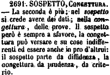 | Sospetto, Congettura - La seconda è più; nel sospetto si crede avere dei dati; nella congettura, delle prove. Il sospetto però è sempre a sfavore, la congettura può versare e su cose indifferenti ed essere anche in pro d'altrui: il sospetto parte da diffidenza, la congettura da prudenza, da criterio. [immagine] |
