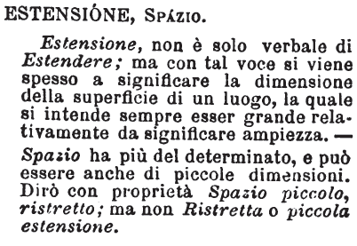 | Estensione, Spazio - Estensione, non è solo verbale di Estendere; ma con tal voce si viene spesso a significare la dimensione della superficie di un luogo, la quale si intende sempre esser grande relativamente da significare ampiezza. - Spazio ha più del determinato, e può essere anche di piccole dimensioni. Dirò con proprietà Spazio piccolo, ristretto; ma non Ristretta o piccola estensione. [immagine] |