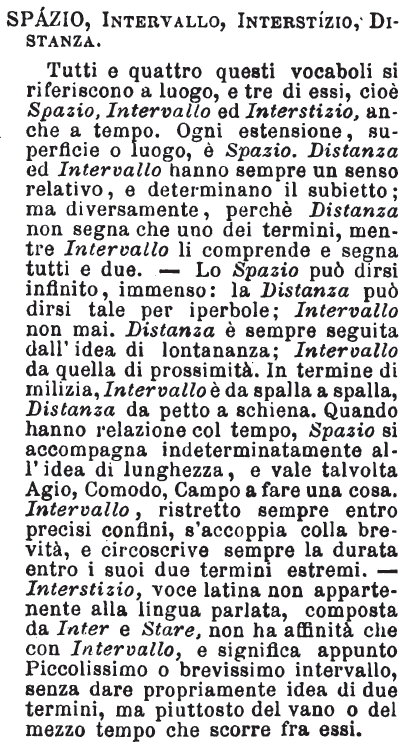 | Spazio, Intervallo, Interstizio, Distanza - Tutti e quattro questi vocaboli si riferiscono a luogo, e tre di essi, cioè Spazio, Intervallo ed Interstizio, anche a tempo. Ogni estensione, superficie o luogo, è Spazio. Distanza ed Intervallo hanno sempre un senso relativo, e determinano il subietto; ma diversamente, perché Distanza non segna che uno dei termini, mentre Intervallo li comprende e segna tutti e due. — Lo Spazio può dirsi infinito, immenso: la Distanza può dirsi tale per iperbole; Intervallo non mai. Distanza è sempre seguita dall'idea di lontananza; Intervallo da quella di prossimità. In termine di milizia, Intervallo è da spalla a spalla, Distanza da petto a schiena. Quando hanno relazione col tempo, Spazio si accompagna indeterminatamente all'idea di lunghezza, e vale talvolta Agio, Comodo, Campo a fare una cosa. Intervallo, ristretto sempre entro precisi confini, s'accoppia colla brevità, e circoscrive sempre la durata entro i suoi due termini estremi. — Interstizio, voce latina non appartenente alla lingua parlata, composta da Inter e Stare, non ha affinità che con Intervallo, e significa appunto Piccolissimo o brevissimo intervallo, senza dare propriamente idea di due termini, ma piuttosto del vano o del mezzo tempo che scorre fra essi. [immagine] |