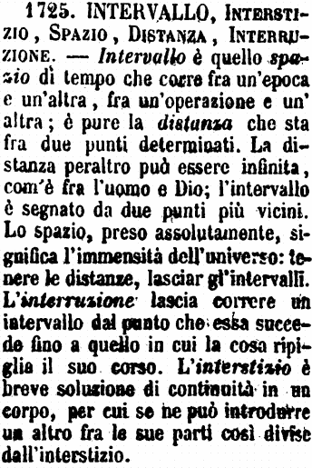 | Intervallo, Interstizio, Spazio, Distanza, Interruzione - Intervallo è quello spazio di tempo che corre fra un'epoca e un'altra, fra un'operazione e un'altra; è pure la distanza che sta fra due punti determinati. La distanza peraltro può essere infinita, com'è fra l'uomo e Dio; l'intervallo è segnato da due punti più vicini. Lo spazio, preso assolutamente, significa l'immensità dell'universo: tenere le distanze, lasciar gl'intervalli. L'interruzione lascia correre un intervallo dal punto che essa succede fino a quello in cui la cosa ripiglia il suo corso. L'interstizio è breve soluzione di continuità in un corpo, per cui se ne può introdurre un altro fra le sue parti così divise dall'interstizio. [immagine] |