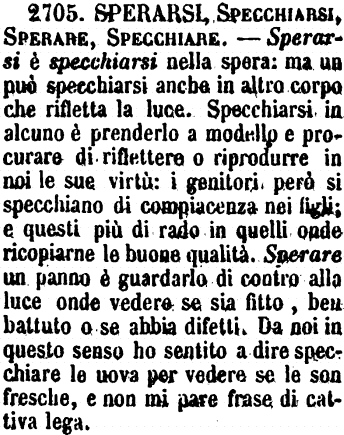 | Sperarsi, Specchiarsi, Sperare, Specchiare - Sperarsi è specchiarsi nella spera: ma un può specchiarsi anche in altro corpo che rifletta la luce. Specchiarsi in alcuno è prenderlo a modello e procurare di riflettere o riprodurre in noi le sue virtù: i genitori però si specchiano di compiacenza nei figli; e questi più di rado in quelli onde ricopiarne le buone qualità. Sperare un panno è guardarlo di contro alla luce onde vedere se sia fitto, ben battuto o se abbia difetti. Da noi in questo senso ho sentito a dire specchiare le uova per vedere se le son fresche, e non mi pare frase di cattiva lega. [immagine] |