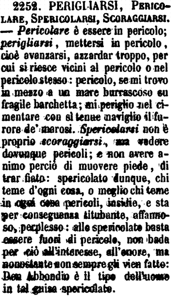 | Perigliarsi, Pericolare, Spericolarsi, Scoraggiarsi - Pericolare è essere in pericolo; perigliarsi, mettersi in pericolo, cioè avanzarsi, azzardar troppo, per cui si riesce vicini al pericolo o nel pericolo stesso: pericolo, se mi trovo in mezzo a un mare burrascoso su fragile barchetta; mi periglio nel cimentare con sì tenue naviglio il furore de' marosi. Spericolarsi non è proprio scoraggiarsi, ma vedere dovunque pericoli; e non avere animo perciò di muovere piede, di trar fiato: spericolato dunque, chi teme d'ogni cosa, o meglio chi teme in ogni cosa pericoli, insidie, e sta pere conseguenza titubante, affannoso, perplesso: allo spericolato basta essere fuori pericolo, non bada per ciò all'interesse, all'onore, ma nonostante non sempre gli vien fatto: Don Abbondio è il tipo dell'uomo in tal guisa spericolato. [immagine] |
