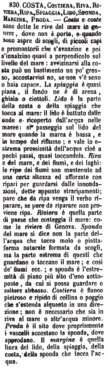 | Costa, Costiera, Riva, Riviera, Ripa, Spiaggia, Lido, Sponda, Margine, Proda - Costa e coste sono dette le rive del mare in genere, dove non è porto, e quando sono aspre di scogli, di piccoli capi e promontorii che s'avanzino e poi s'innalzino quasi a perpendicolo sul livello del mare: avvicinarsi alla costa può un bastimento un po' grosso, accostarvisi no, se non v'è seno o baia capace. La spiaggia è quasi piana, il fondo ne è di arena, ghiaia o ciottoli. Lido è la parte della costa o della spiaggia che tocca al mare: il lido è battuto dalle onde e ricoperto dall'acqua nelle maree: si passeggia sul lido del mare quando la marea è bassa, e in tempo del riflusso; e vale in estrema prossimità dell'acqua cioè a pochi passi, quasi toccandola. Riva e del mare, e dei fiumi, e dei laghi: le ripe dei fiumi son mantenute ad una certa altezza ed afforzate con ripari per guardarsi dalle innondazioni, dette appunto straripamenti; pare che da ripa venga il verbo riparare, se pure da riparare non proviene ripa. Riviera è quella parte di paese che costeggia il mare: come le riviere di Genova. Sponda del mare si dice non la parte dell'acqua che tocca molo o piattaforma naturale formata da scogli, ma la parte estrema di questi che guardano o toccano il mare; e così de' fiumi ecc.; e sponda è l'estremità di piano più alto d'uno sottoposto, da cui si possa guardare o saltare abbasso. Costiera è fianco pietroso e ripido di collina o poggio che s'estenda alquanto in una direzione; non è necessario che sia in riva al mare o altr'acqua minore. Proda è il sito dove propriamente i vascelli accostano la sponda, dove approdano. Il margine è quella linea del lido, della spiaggia, della costa, della sponda che tocca l'acqua. [immagine] |