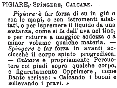 | Pigiare, Spingere, Calcare - Pigiare è far forza di su in giù o con le mani, o con istromenti adattati, o per ispremere il liquido da una sostanza, come si fa dell'uva nel tino, o per ridurre a maggior sodezza o a minor volume qualche materia. - Spingere è far forza in avanti acciocchè il corpo spinto progredisca. - Calcare è propriamente Percuotere coi piedi sopra qualche corpo, e figuratamente Opprimere, come Dante scrisse: «Calcando i buoni e sollevando i pravi.» [immagine] |