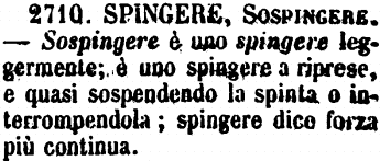 | Spingere, Sospingere - Sospingere è uno spingere leggermente; è uno spingere a riprese, e quasi sospendendo la spinta o interrompendola; spingere dice forza più continua. [immagine] |