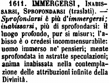 | Immergersi, Inabissarsi, Sprofondarsi (traslati) - Sprofondarsi è più d'immergersi; inabissarsi, più di sprofondarsi: il luogo profondo, pur si misura; l'abisso è o credesi incommensurabile: uomo immerso ne' pensieri; mente sprofondata in astratte speculazioni; anima inabissata nella contemplazione delle attribuzioni infinite della Divinità. [immagine] |
