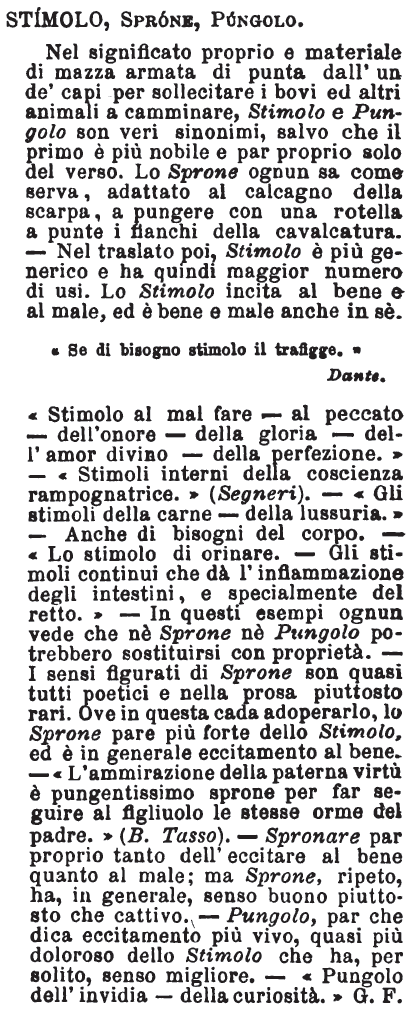 | Stimolo, Sprone, Pungolo - Nel significato proprio e materiale di mazza armata di punta dall'un de' capi per sollecitare i bovi ed altri animali a camminare, Stimolo e Pungolo son veri sinonimi, salvo che il primo è più nobile e par proprio solo del verso. Lo Sprone ognun sa come serva, adattato al calcagno della scarpa, a pungere con una rotella a punte i fianchi della cavalcatura. - Nel traslato poi, Stimolo è più generico e ha quindi maggior numero di usi. Lo Stimolo incita al bene e al male, ed è bene e male anche in sé.