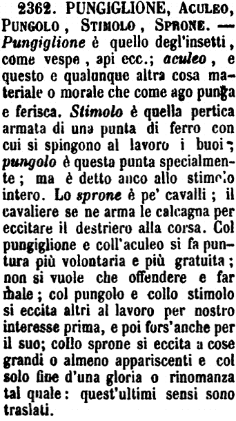 | Pungiglione, Aculeo, Pungolo, Stimolo, Sprone - Pungiglione è quello degl'insetti, come vespe, api ecc.; aculeo, e questo e qualunque altra cosa materiale o morale che come ago punga e ferisca. Stimolo è quella pertica armata di una punta di ferro con cui si spingono al lavoro i buoi; pungolo è questa punta specialmente; ma è detto anco allo stimolo intero. Lo sprone è pe' cavalli; il cavaliere se ne arma le calcagna per eccitare il destriero alla corsa. Col pungiglione e coll'aculeo si fa puntura più volontaria e più gratuita; non si vuole che offendere e far male; col pungolo e collo stimolo si eccita altri al lavoro per nostro interesse prima, e poi fors'anche per il suo; collo sprone si eccita a cose grandi o almeno appariscenti e col solo fine d'una gloria o rinomanza tal quale: quest'ultimi sensi sono traslati. [immagine] |