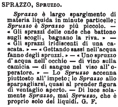 | Sprazzo, Spruzzo - Sprazzo è largo spargimento di materia liquida in minute particelle; Spruzzo è Sprazzo più piccolo. - «Gli sprazzi delle onde che battono sugli scogli, bagnano la riva.» - «Gli sprazzi iridiscenti di una cascata.» - «Gettando sassi nell'acqua fanno degli spruzzi.» - «Uno spruzzo d'acqua nell'occhio - di vino sulla camicia - di sangue nel viso all'operatore.» - Lo Spruzzo accenna piuttosto all'impeto; lo Sprazzo allo sparpagliarsi, quasi al prender figura di ventaglio aperto. - Di luce solamente Sprazzo, mai Spruzzo, che è proprio solo dei liquidi. G. F. [immagine] |
