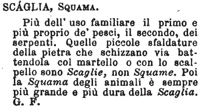 | Scaglia, Squama - Più dell'uso familiare il primo e più proprio de' pesci, il secondo, dei serpenti. Quelle piccole sfaldature della pietra che schizzano via battendola col martello o con lo scalpello sono Scaglie, non Squame. Poi la Squama degli animali è sempre più grande e più dura della Scaglia. G.F. [immagine] |