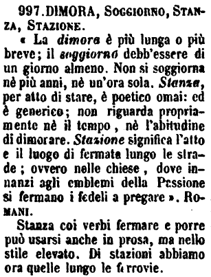 | Dimora, Soggiorno, Stanza, Stazione - «La dimora è più lunga o più breve; il soggiorno debb'essere di un giorno almeno. Non si soggiorna nè più anni, nè un'ora sola. Stanza, per atto di stare, è poetico ormai: ed è generico; non riguarda propriamente nè il tempo, nè l'abitudine di dimorare. Stazione significa l'atto e il luogo di fermata lungo le strade; ovvero nelle chiese, dove innanzi agli emblemi della Passione si fermano i fedeli a pregare». Romani.