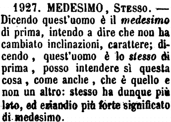 | Medesimo, Stesso - Dicendo, Quest'uomo è il medesimo di prima, intendo dire che non ha cambiato inclinazioni, di carattere. - Dicendo, Quest'uomo è lo stesso di prima, posso intendere sì questa cosa, come anche, che è quello e non un altro. Stesso ha dunque più lato, ed eziandio più forte significato di Medesimo. [immagine] |