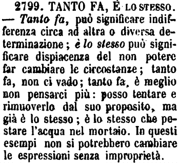| Tanto fa, È lo stesso - Tanto fa, può significare indifferenza circa ad altra o diversa determinazione; è lo stesso può significare dispiacenza del non potere far cambiare le circostanze; tanto fa, non ci vado; tanto fa, è meglio non pensarci più: posso tentare e rimuoverlo dal suo proposito, ma già è lo stesso; è lo stesso che pestare l'acqua nel mortaio. In questi esempi non si potrebbero cambiare le espressioni senza improprietà. [immagine] |
