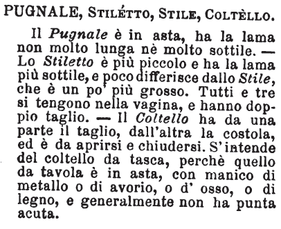 | Pugnale, Stiletto, Stile, Coltello - Il Pugnale è in asta, ha la lama non molto lunga nè molto sottile. - Lo Stiletto è più piccolo e ha la lama più sottile, e poco differisce dallo Stile, che è un po' più grosso. Tutti e tre si tengono nella vagina, e hanno doppio taglio. - Il Coltello ha da una parte il taglio, dall'altra la costola, ed è da aprirsi e chiudersi. S'intende del coltello da tasca, perchè quello da tavola è in asta, con manico di metallo o di avorio, o d'osso, o di legno, e generalmente non ha punta acuta. [immagine] |