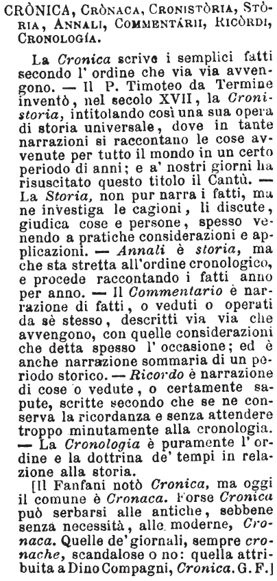 Cronica, Cronaca, Cronistoria, Storia, Annali, Commentarii, Ricordi, Cronologia - La Cronica scrive i semplici fatti secondo l’ordine che via via avvengono. – Il P. Timoteo da Termine inventò, nel secolo XVII, la Cronistoria, intitolando così una sua opera di storia universale, dove in tante narrazioni si raccontano le cose avvenute per tutto il mondo in un certo periodo di anni; e a’ nostri giorni ha risuscitato questo titolo il Cantù. – La Storia, non pur narra i fatti, ma ne investiga le cagioni, li discute, giudica cose e persone, spesso venendo a pratiche considerazioni e applicazioni. - Annali è storia, ma che sta stretta all’ordine cronologico, e procede raccontando i fatti anno per anno. – Il Commentario è narrazione di fatti, o veduti o operati da sè stesso, descritti via via che avvengono, con quelle considerazioni che detta spesso l’occasione; ed è anche narrazione sommaria di un periodo storico. - Ricordo è narrazione di cose o vedute, o certamente sapute, scritte secondo che se ne conserva la ricordanza e senza attendere troppo minutamente alla cronologia. – La Cronologia è puramente l’ordine e la dottrina de’ tempi in relazione alla storia.