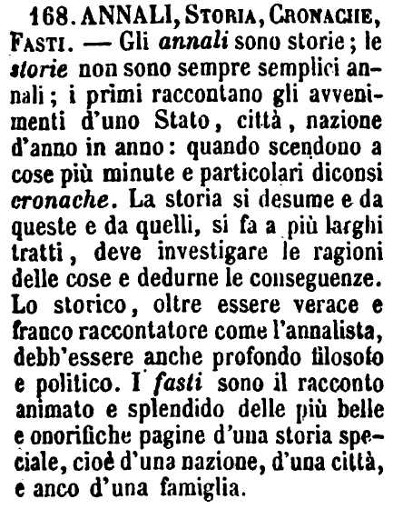| Annali, Storia, Cronache, Fasti - Gli annali sono storie; le storie non sono sempre semplici annali; i primi raccontano gli avvenimenti d'uno Stato, città, nazione d'anno in anno: quando scendono a cose più minute e particolari diconsi cronache. La storia si desume e da queste e da quelli, si a fa più larghi tratti, deve investigare le ragioni delle cose e dedurne le conseguenze. Lo storico, oltre essere verace e franco raccontatore come l'annalista, debb'essere anche profondo filosofo e politico. I fasti sono il racconto animato e splendido delle più belle e onorifiche pagine d'una storia speciale, cioè d'una nazione, d'una città, e anco d'una famiglia. [immagine] |