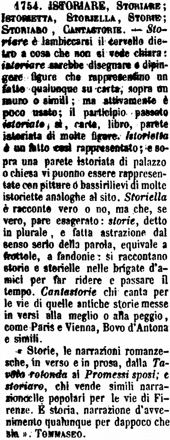 «Storie, le narrazioni romanzesche, in verso e in prosa, dalla Tavola rotonda ai Promessi sposi; e storiaro, chi vende simili narrazioncelle popolari per le vie di Firenze. È storia, narrazione d'avvenimento qualuque per dappoco che sia». Tommaseo. [immagine] |