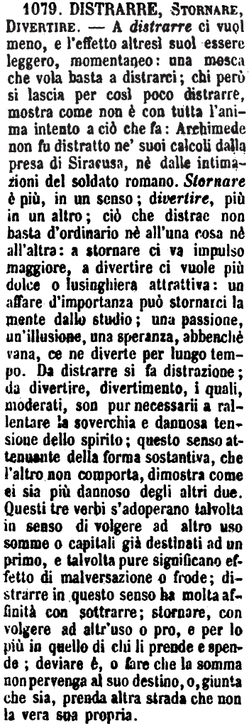 | Distrarre, Stornare, Divertire - A distrarre ci vuol meno, e l'effetto altresì suol essere leggero, momentaneo: una mosca che vola basta a distrarci; chi però si lascia per così poco distrarre, mostra come non è con tutta l'anima intento a ciò che fa: Archimede non fu distratto ne' suoi calcoli dalla presa di Siracusa, nè dalle intimazioni del soldato romano. Stornare è più, in un senso; divertire, più in un altro; ciò che distrae non basta d'ordinario nè all'una cosa nè all'altra: a stornare ci va impulso maggiore, a divertire ci vuole più dolce o lusinghiera attrattiva: un affare d'importanza può stornarci la mente dallo studio; una passione, un'illusione, una speranza, abbenchè vana, ce ne diverte per lungo tempo. Da distrarre si fa distrazione; da divertire, divertimento, i quali, moderati, son pur necessarii a rallentare la soverchia e dannosa tensione dello spirito; questo senso attenuante della forma sostantiva, che l'altro non comporta, dimostra come ci sia più dannoso degli altri due. Questi tre verbi s'adoperano talvolta in senso di volgere ad altro uso somme o capitali già destinati ad un primo, e talvolta pure significano effetto di malversazione o frode; distrarre in questo senso ha molta affinità con sottrarre; stornare, con volgere ad altr'uso o pro, e per lo più in quello di chi li prende e spende; deviare è, o fare che la somma non pervenga al suo destino, o, giunta che sia, prenda altra strada che non la vera sua propria. [immagine] |