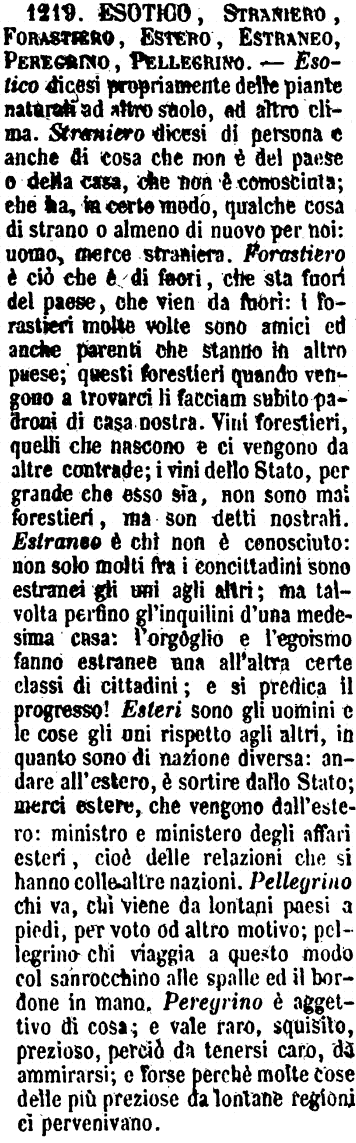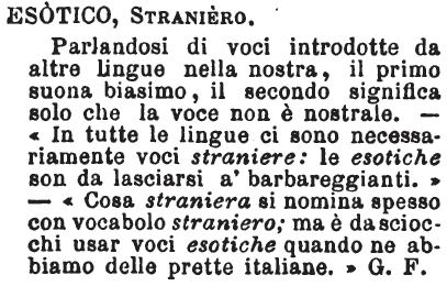 | Esotico, Straniero - Parlandosi di voci introdotte da altre lingue nella nostra, il primo suona biasimo, il secondo significa solo che la voce non è nostrale. - «In tutte le lingue ci sono necessariamente voci straniere: le esotiche son da lasciarsi a' barbareggianti.» - «Cosa straniera si nomina spesso con vocabolo straniero; ma è da sciocchi usar voci esotiche quando ne abbiamo delle prette italiane.» G. F. [immagine] |