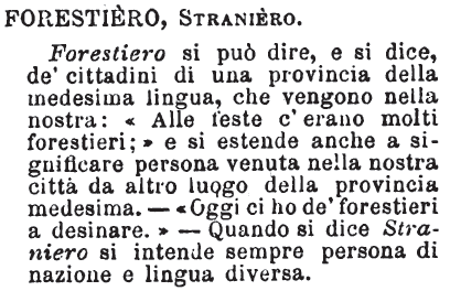 | Forestiero, Straniero - Forestiero si può dire, e si dice, de' cittadini di una provincia della medesima lingua, che vengono nella nostra: «Alle feste c'erano molti forestieri;» e si estende anche a significare persona venuta nella nostra città da altro luogo della provincia medesima. - «Oggi ci ho de' forestieri a desinare.» - Quando si dice Straniero si intende sempre persona di nazione e lingua diversa. [immagine] |