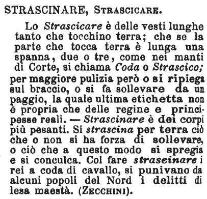 | Strascinare, Strascicare - Lo Strascicare è delle vesti lunghe tanto che tocchino terra; che se la parte che tocca terra è lunga una spanna, due o tre, come nei manti di Corte, si chiama Coda o Strascico; per maggiore pulizia però o si ripiega sul braccio, o si fa sollevare da un paggio, la quale ultima etichetta non è propria che delle regine e principesse reali. - Strascinare è dei corpi più pesanti. Si strascina per terra ciò che o non si ha forza di sollevare, o ciò che a questo modo si spregia e si conculca. Col fare strascinare i rei a coda di cavallo, si punivano da alcuni popoli del Nord i delitti di lesa maestà. (Zecchini). [immagine] |