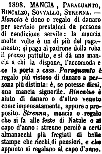 | Mancia, Paraguanto, Rincalzo, Sovvallo, Strenna - Mancia è dono o regalo di danaro per servizio prestatoci da persona di condizione servile: la mancia molte volte è un di più del pagamento; si paga al padrone della roba il prezzo pattuito, e si dà una mancia a chi la dispone, l'accomoda e ce la porta a casa. Paraguanto è regalo più vistoso di danaro a persona più distinta: è, se potesse dirsi, una mancia signorile. Rincalzo è aiuto di danaro o d'altro venuto come impensatamente, eppure a proposito. Strenna, mancia o regalo che si fa alle feste di Natale o al capo d'anno: strenne perciò a certi almanacchi più fregiati di belle stampe che ricchi di pensieri, e che appunto si regalano al capo d'anno. [immagine] |