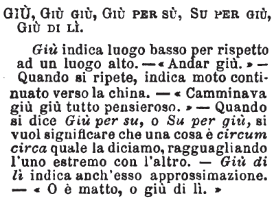 | Giù, Giu giù, Giù per Sù, Su per Giù, Giù di lì - Giù indica luogo basso per rispetto ad un luogo alto. - « Andar giù. » - Quando si ripete, indica moto continuato verso la china. - « Camminava giù giù tutto pensieroso. » - Quando si dice Giù per su, o Su per giù, si vuol significare che una cosa è circum circa quale la diciamo, ragguagliando l'uno estremo con l'altro. - Giù di lì indica anch'esso approssimazione. - « O è matto, o giù di lì. » [immagine] |