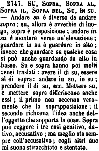 | Su, Sopra, Sopra al, Sopra il, Sopra del, Su, In su - Andare su è diverso da andare sopra; su, allora è avverbio di luogo, sopra è preposizione; andare in su è montare verso un'elevazione; guardare in su è guardare in alto; invece che guardare su qualche cosa si può anche guardando da alto in basso. Su e sopra hanno poi molti sensi traslati: aver il di su, essere al di sopra: andare in su, in su; prendere il di su, ecc. Mettere su, e mettere sopra differiscono anche essi; il primo non accenna veramente che la soprapposizione; il secondo richiama l'idea anche dell'oggetto che sopporta la cosa. Sopra può reggere i tre casi genitivo, dativo, accusativo; ma meglio sta sempre coll'accusativo; cogli altri due mi suona stiracchiato e stentato. [immagine] |