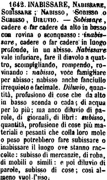 | Inabissare, Nabissare, Sobissare; Nabisso, Sobisso o Subisso, Diluvio - Sobissare, cadere e far cadere da alto in basso con rovina o sconquasso: inabissare, cadere o far cadere in luogo profondo, in un abisso. Nabissare vale infuriare, fare il diavolo a quattro, scompigliando, rompendo, rovinando: nabisso, voce famigliare per abisso; nabisso anche fanciullo irrequieto e facimale. Diluvio, quantità, profusione di cose che da alto in basso scenda o cada; di acqua per lo più; ma anco diluvio di parole, di giornali, di libri: subisso, quantità, profusione di cose più materiali e pesanti che colla loro mole o peso potrebbero fare subissare o inabissare il luogo ove stanno raccolte: subisso di mercanzie, di roba, di mobili o simili: e poi diluvio di parole, subisso di cose; così almeno vuol l'uso. [immagine] |