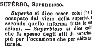 | Superbo, Superbioso - Superbo si dice esser colui che è occupato dal vizio della superbia, e secondo quello informa tutte le sue azioni. - Superbioso si dice colui che fa spesso degli atti di superbia, più per l'occasione che per abito naturale. [immagine] |