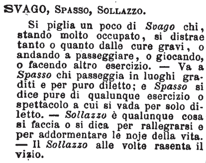 | Svago, Spasso, Sollazzo - Si piglia un poco di Svago chi, stando molto occupato, si distrae tanto o quanto dalle cure gravi, o andando a passeggiare, o giocando, o facendo altro esercizio. - Va a Spasso chi passeggia in luoghi graditi e per puro diletto; e Spasso si dice pure di qualunque esercizio o spettacolo a cui si vada per solo diletto. - Sollazzo è qualunque cosa si faccia o si dica per rallegrarsi e per addormentare le noje della vita. - Il Sollazzo alle volte rasenta il vizio. [immagine] |