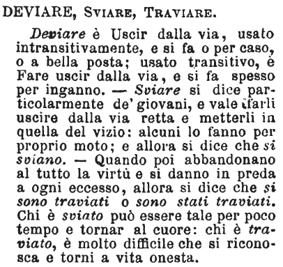 | Traviare, Sviare - Traviare è Trar fuori della via diritta, cioè Incitare altrui, con parole ed esempii, a darsi a mala vita e alla scostumatezza. - Sviare è Fare in modo che altri, pigliando gusto a cose vane e di puro diletto, abbandoni lo studio e le proprie occupazioni. Si usa anche riflessivo, perchè ciò può farsi anche per propria volontà e senza altrui istigazione. Il Traviato è sempre corrotto, lo Sviato può non esser tale e agevolmente può ritornare ad bonam frugem. [immagine] |