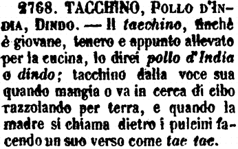 | Tacchino, Pollo d’India, Dindo - Il tacchino, finchè è giovane, tenero e appunto allevato per la cucina, lo direi pollo d'India o dindo; tacchino dalla voce sua quando mangia o va in cerca di cibo razzolando per terra, e quando la madre si chiama dietro i pulcini facendo un suo verso come tac tac. [immagine] |