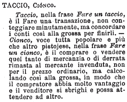 | Taccio, Cionco - Taccio, nella frase Fare un taccio, è il Fare una transazione, non conteggiare minutamente, ma concordare i conti così alla grossa per finirli. - Cionco, voce tutta popolare e più che altro pistojese, nella frase Fare un cionco, è il comprare o vendere quel tanto di mercanzia o di derrata rimasta al mercante invenduta, non per il prezzo ordinario, ma calcolando così alla grossa, in modo che il compratore abbia molto vantaggio e il venditore si sbrighi e possa attendere ad altro. [immagine] |
