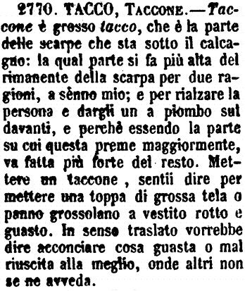 | Tacco, Taccone - Il Tacco è quel rialzo di suola che si mette alle scarpe nel punto dove corrisponde il calcagno. - Il Taccone è pezzo di suolo che si appicca alle scarpe rotte. [immagine] |