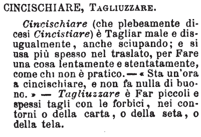 | Cincischiare, Tagliuzzare - Cincischiare (che plebeamente dicesi Cincistiare) è Tagliar male e disugualmente, anche sciupando; e si usa più spesso nel traslato, per Fare una cosa lentamente e stentatamente, come chi non è pratico. - « Sta un'ora a cincischiare, e non fa nulla di buono. » - Tagliuzzare è Far piccoli e spessi tagli con le forbici, nei contorni o della carta, o della seta, o della tela. [immagine] |