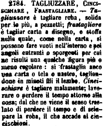 | Tagliuzzare, Cincischiare, Frastagliare - Tagliuzzare è tagliare roba, solida per lo più, a pezzetti; frastagliare è tagliar carta a disegno, o stoffa nella quale, come nella carta, si possono fare vuoti nell'interno e poi angoli entranti o sporgenti per cui ne risulti una qualche figura più o meno regolare: si frastaglia anco una carta o tela o nastro, tagliandone in minuti fili il lembo. Cincischiare è tagliare malamente; lavorare o perdere il tempo attorno alla cosa; dal che ne viene il senso traslato di perdere il tempo e di sciupare la roba, il che accade ai cincischioni. [immagine] |