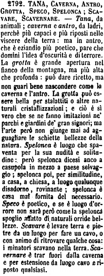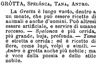 | Grotta, Spelonca, Tana, Antro - La Grotta è il luogo vuoto, dentro a un monte, che può essere ricetto di animali e anche d'uomini. Può altresì essere artificiale, e servire di umano recesso. - Spelonca è più orrida, più grande, buja, profonda. - Tana è stretta e orrida; ed è ricetto di fiere, come lupi, volpi e simili. - Antro è grotta anche più nobile; ma è voce della poesia e dello stile nobile. [immagine] |