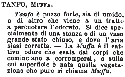 | Tanfo, Muffa - Tanfo è puzzo forte, sia di umido, o di altro che viene a un tratto a percuotere l'odorato. Si dice specialmente di una stanza o di un vaso grande stato chiuso, e dove l'aria siasi corrotta. - La Muffa è il cattivo odore che esala dai corpi che cominciano a corrompersi, e sulla cui superficie è nata quella vegetazione che pure si chiama Muffa. [immagine] |