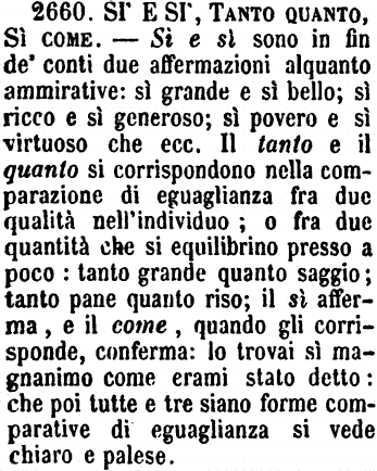 | Sì e sì, Tanto quanto, Sì come - Sì e sì sono in fin de' conti due affermazioni alquanto ammirative: sì grande e sì bello; sì ricco e sì generoso; sì povero e sì virtuoso che ecc. Il tanto e il quanto si corrispondono nella comparazione di eguaglianza fra due qualità nell'individuo; o fra due quantità che si equilibrino presso a poco: tanto grande quanto saggio; tanto pane quanto riso; il sì afferma, e il come, quando gli corrisponde, conferma: lo trovai sì magnanimo come erami stato detto: che poi tutte e tre siano forme comparative di eguaglianza si vede chiaro e palese. [immagine] |