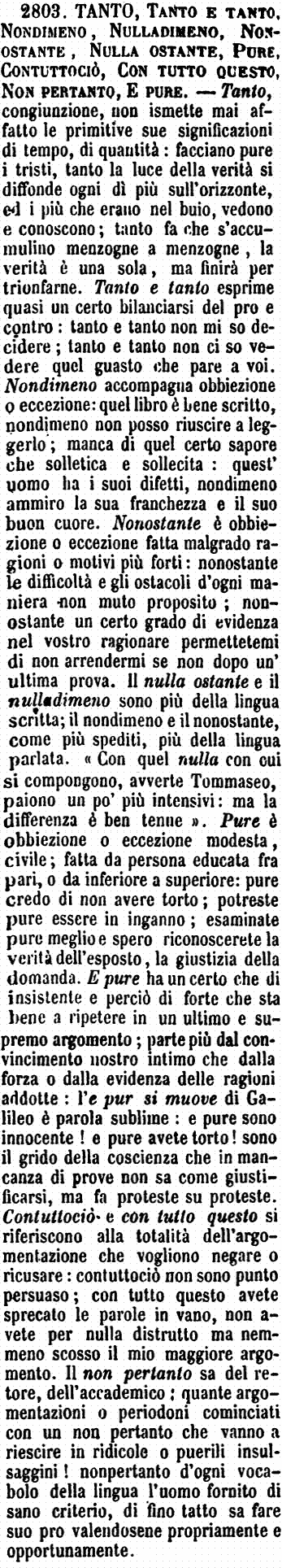 | Tanto, Almeno - Il tanto esprime desiderio in più; almeno, lo esprime, come di ragione, in meno; fate tanto che io riesca; cioè quanto basta: fate almeno che io non sia del tutto pregiudicato: questo desiderio è più limitato o più modesto dell'altro. Le due parole bene s'accordano assieme in un modo correttivo una dell'altra; fate tanto che almeno men vada consolato; ditene almeno tanto quanto basta a giustificarmi. [immagine] |