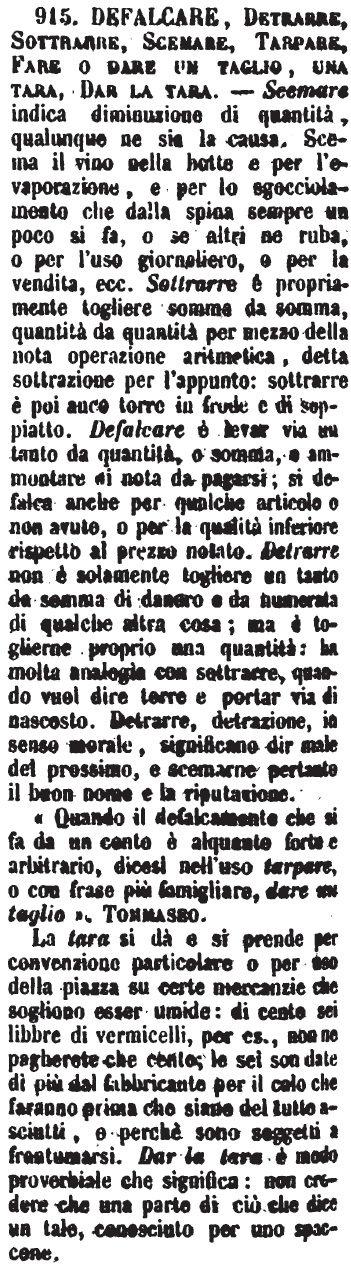 | Defalcare, Detrarre, Sottrarre, Scemare, Tarpare, Fare o Dare un taglio, Una tara, Dar la tara - Scemare indica diminuzione di quantità, qualunque ne sia la causa. Scema il vino nella botte e per l'evaporazione, e per lo sgocciolamento che dalla spina sempre un poco si fa, o se altri ne ruba, o per l'uso giornaliero, o per la vendita, ecc. Sottrarre è propriamente togliere somme da somma, quantità da quantità per mezzo della nota operazione aritmetica, detta sottrazione per l'appunto: sottrarre è poi anco torre in frode e di soppiatto. Defalcare è levar via un tanto da quantità, o somma, o ammontare di nota da pagarsi; si defalca anche per qualche articolo o non avuto, o per la qualità inferiore rispetto al prezzo notato. Detrarre non è solamente togliere un tanto da somma di danaro e da numerata di qualche altra cosa; ma è toglierne proprio una quantità: ha molta analogia con sottrarre, quando vuol dire torre e portar via di nascosto. Detrarre, detrazione, in senso morale, significano dir male del prossimo, e scemarne pertanto il buon nome e la riputazione.